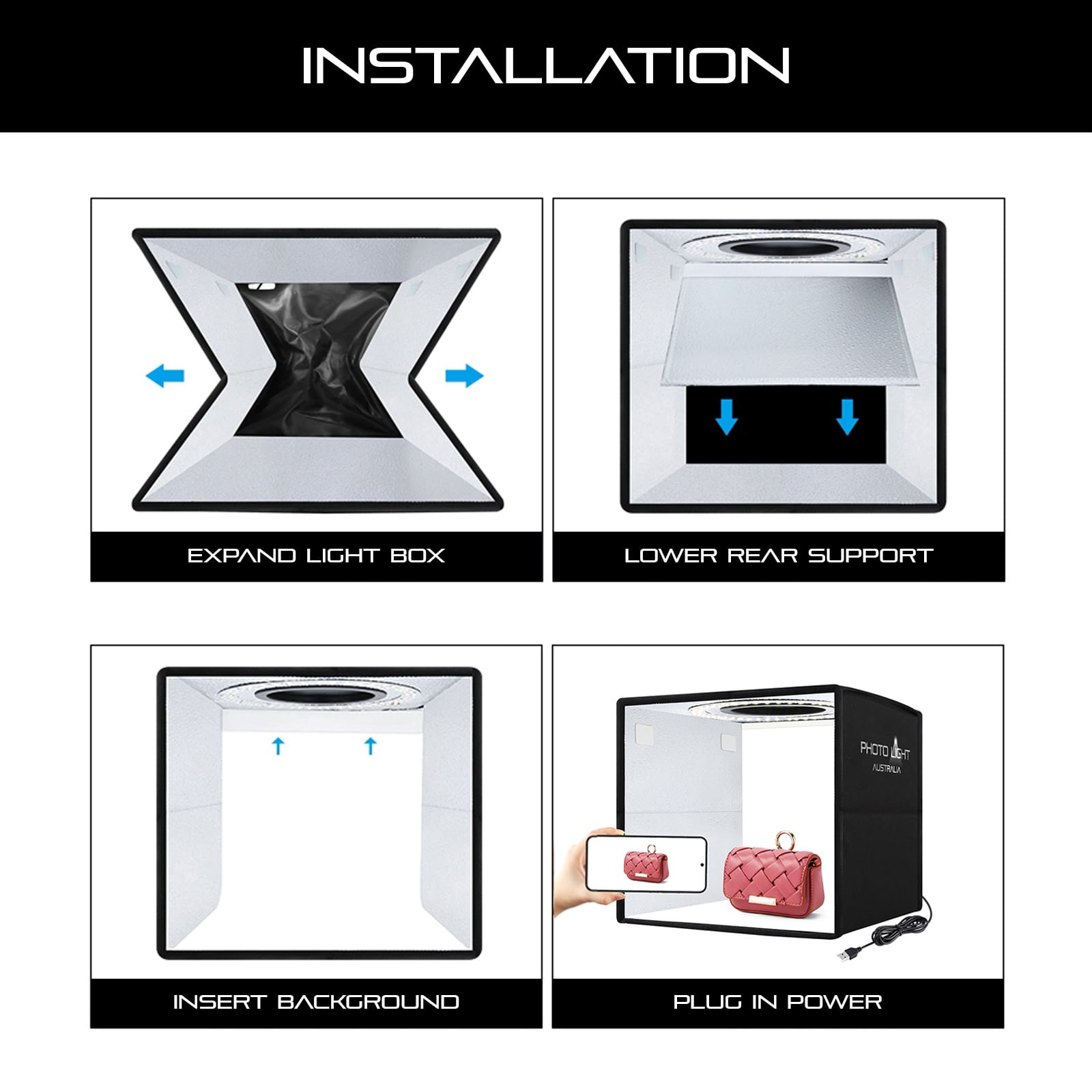 With its innovative design, this photography lightbox allows you to set up a professional studio in just three seconds. Simply unfold the LED lightbox and place it on any surface to create the perfect backdrop for your product photography. Its compact and portable folding design + carry bag makes it easy to install and carry, so you can capture amazing shots wherever you go.